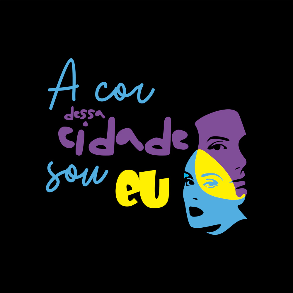 Camiseta Preta - Estampa nas cores azul, roxa e amarela com a frase estilizada "A cor dessa cidade sou eu" e ao lado uma composição com duas máscaras.
