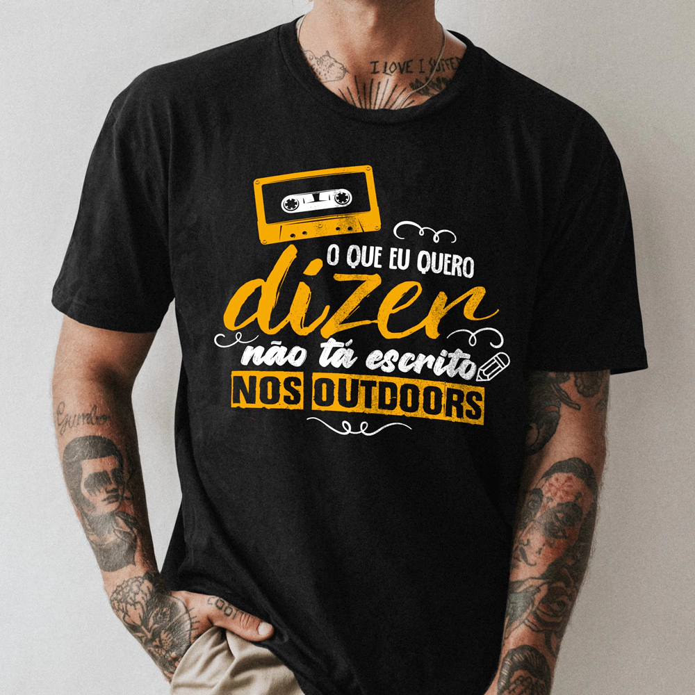 Camiseta preta e vermelha - Estampa nas cores preto e amarelo com imagem estilizada de uma fita cassete e um lápis compondo a frase "O que eu quero dizer não tá escrito nos outdoors"