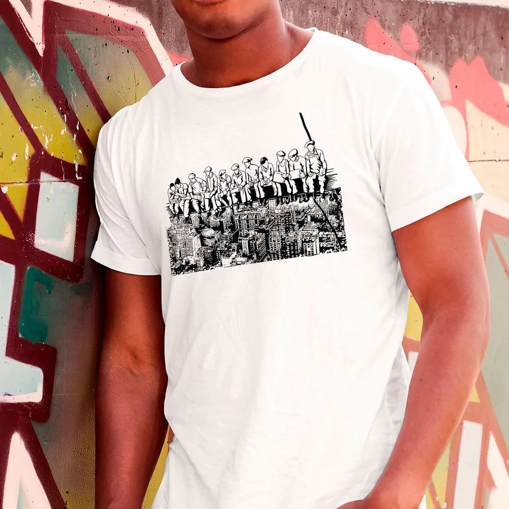 Camiseta branca, lilás e vermelha – Ilustração do artista Rafael Camilo da icônica fotografia "Almoço no topo de um arranha-céu" estampada na cor preta.