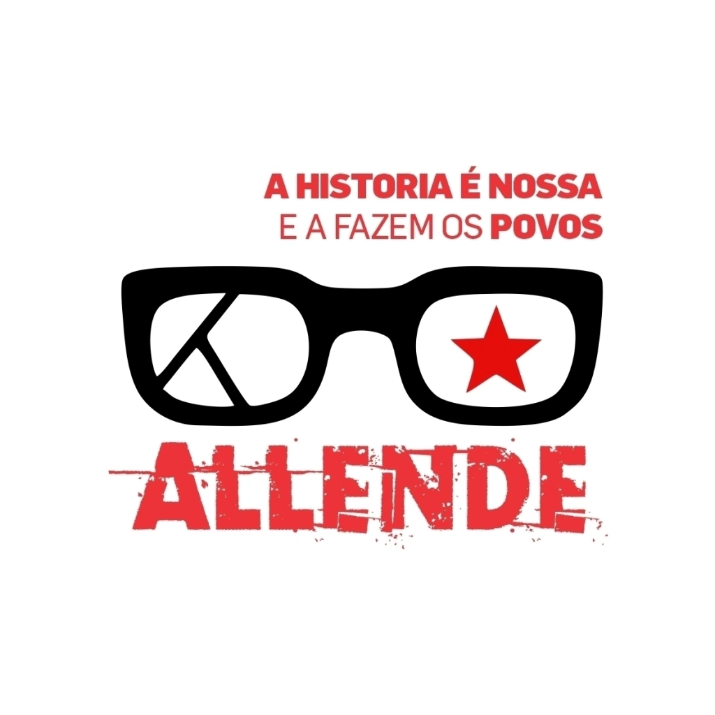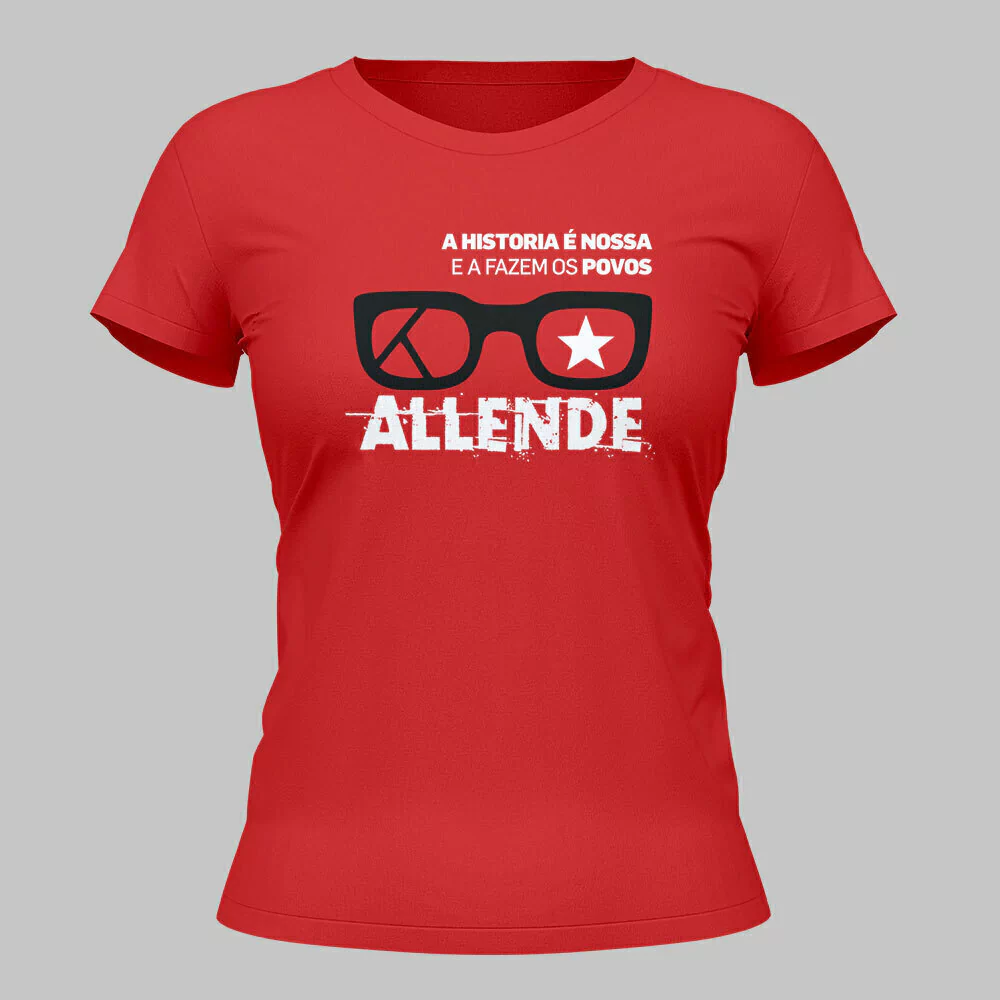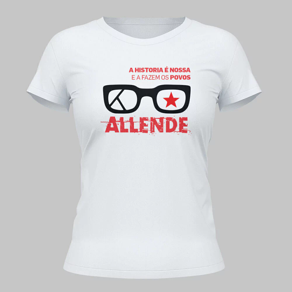 Camiseta branca – Ilustração (na cor preta) dos tradicionais óculos de armação grossa quebrados após sua morte com uma estrela (vermelha). Frase estampada na cor vermelha “A história é nossa e a fazem os povos”, abaixo dos óculos: Allende (na cor vermelha).