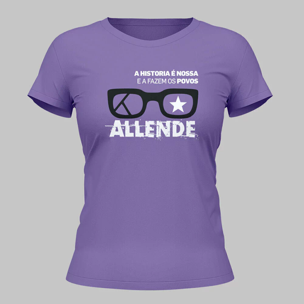 Camiseta lilás e vermelha – Ilustração (na cor preta) dos tradicionais óculos de armação grossa quebrados após sua morte com uma estrela (branca). Frase estampada na cor branca “A história é nossa e a fazem os povos”, abaixo dos óculos: Allende (na cor branca).