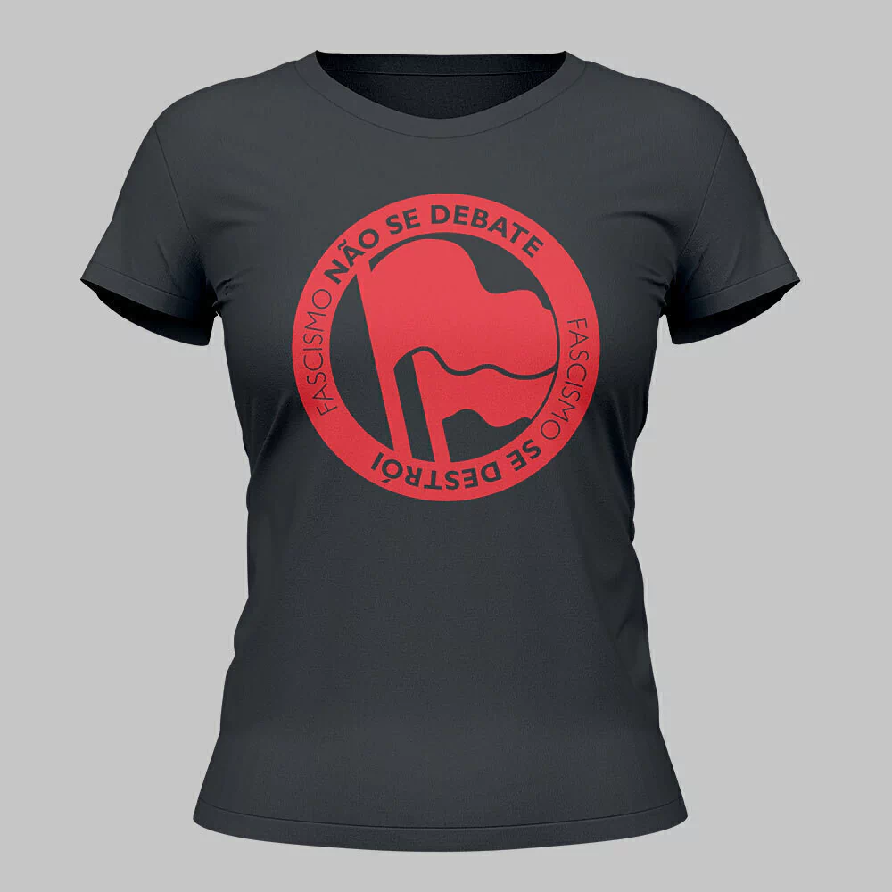 Camiseta preta e branca - Estampa na cor vermelha em círculo com a frase: “Fascismo não se debate Fascismo se destrói” com duas bandeiras no centro.