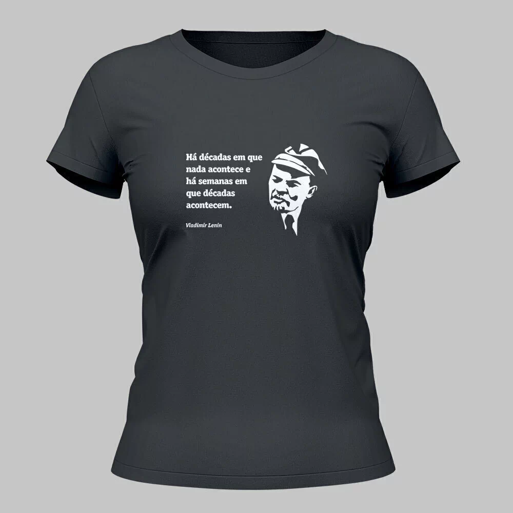Camiseta preta – Imagem de Lênin com boina estampada na cor branca com a seguinte inscrição ao lado: "Há décadas em que nada acontece e há semanas em que décadas acontecem. Vladimir Lenin"