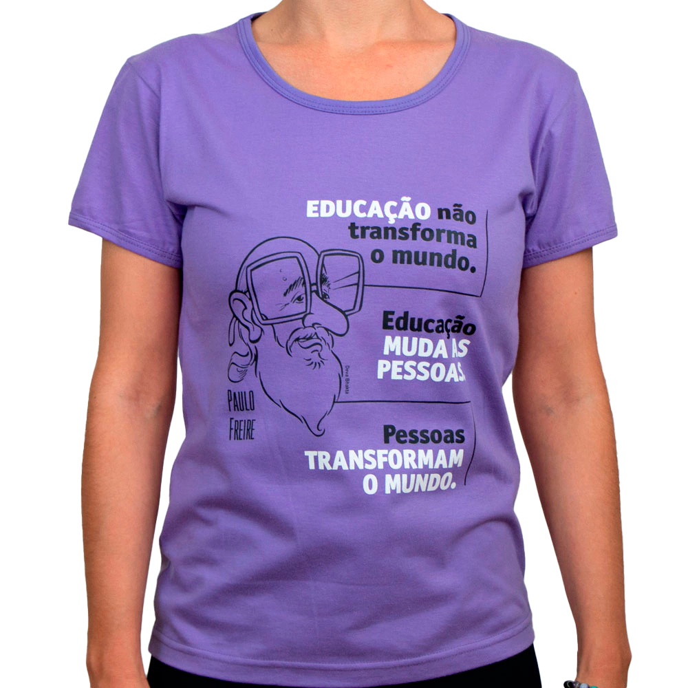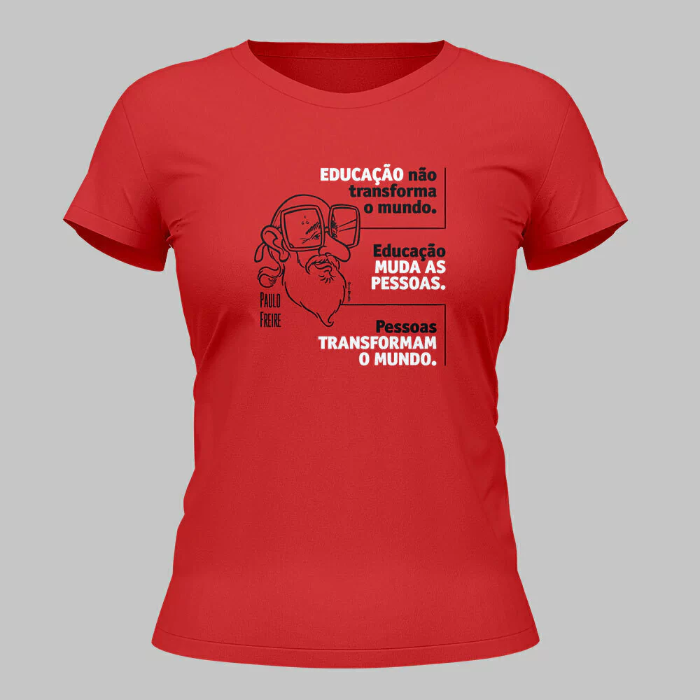 Camiseta vermelha e lilás – Estampa na cor branca e preta com a seguinte inscrição: "Educação não transforma o mundo. Educação muda as pessoas. Pessoas transformam o mundo. Paulo Freire". Ao lado da frase caricatura de Paulo Freire.