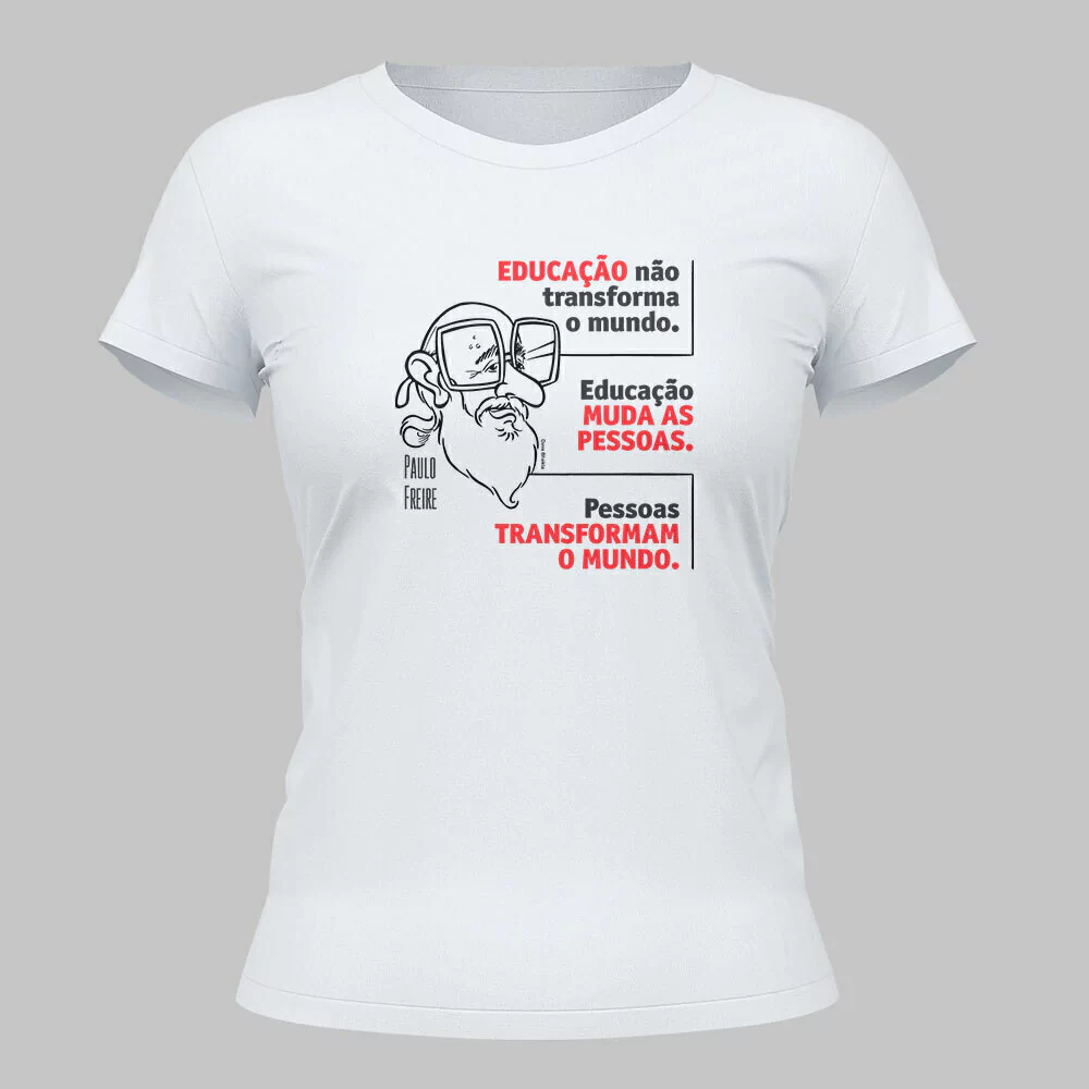 Camiseta branca – Estampa na cor preta e vermelha com a seguinte inscrição: "Educação não transforma o mundo. Educação muda as pessoas. Pessoas transformam o mundo. Paulo Freire". Ao lado da frase caricatura de Paulo Freire.