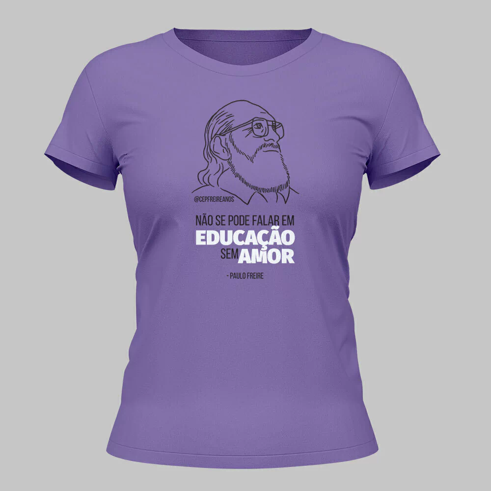 Camiseta lilás e vermelha - Estampa na cor preta e branca com a seguinte inscrição: "Não se pode falar em educação sem amor. Paulo Freire". Acima da frase caricatura de Paulo Freire.
