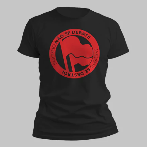 Camiseta preta e branca - Estampa na cor vermelha em círculo com a frase: “Fascismo não se debate Fascismo se destrói” com duas bandeiras no centro.