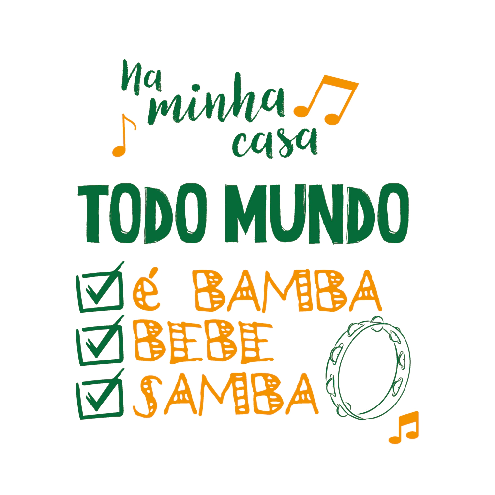 Camiseta branca - Estampa nas cores verde e laranja com a frase "Na minha casa todo mundo é bamba, bebe, samba" com elementos como cifras e pandeiro compondo a imagem