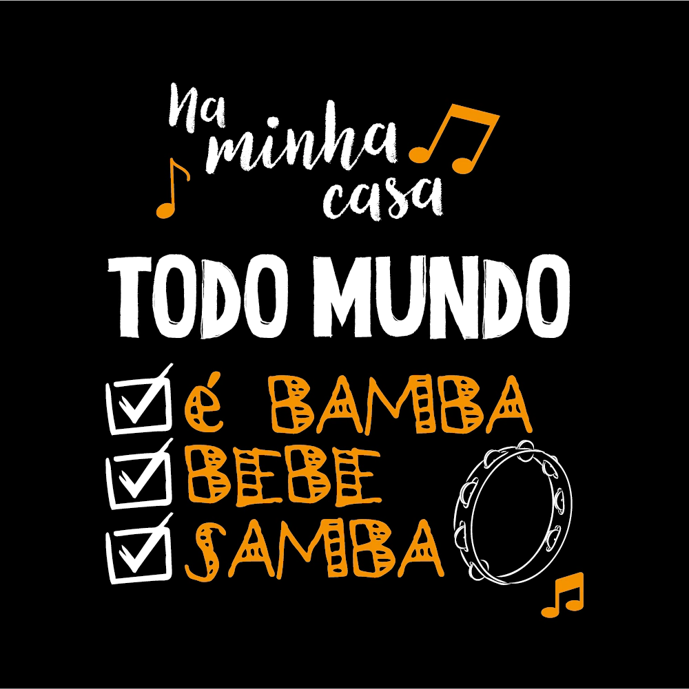 Camiseta preta e vermelha - Estampa nas cores branca e laranja com a frase "Na minha casa todo mundo é bamba, bebe, samba" com elementos como cifras e pandeiro compondo a imagem