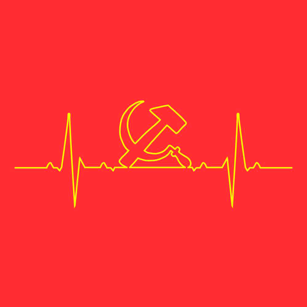 Camiseta branca – Ilustração (na cor vermelha) da foice e o martelo seguindo um batimento cardíaco.