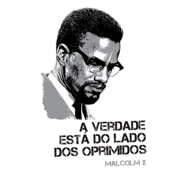 Camiseta branca - Ilustração de Malcom X com a frase "A verdade está do lado dos oprimidos" Malcom X em preto.