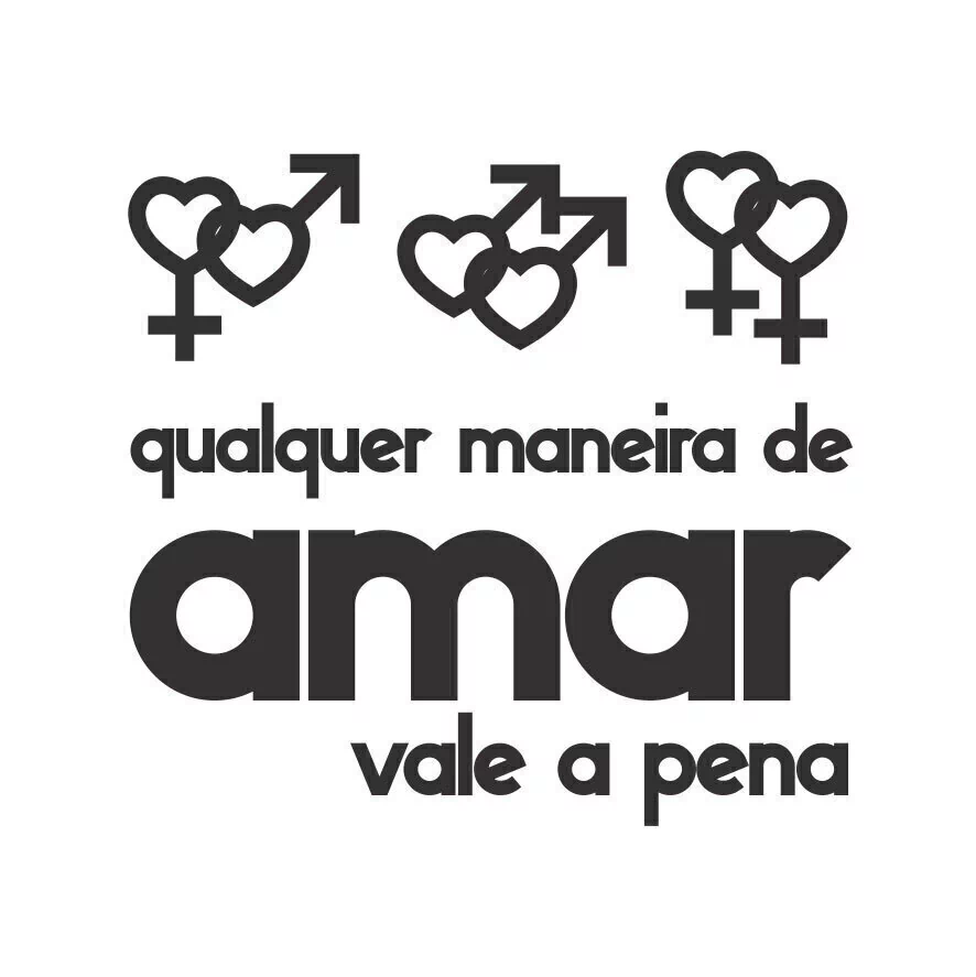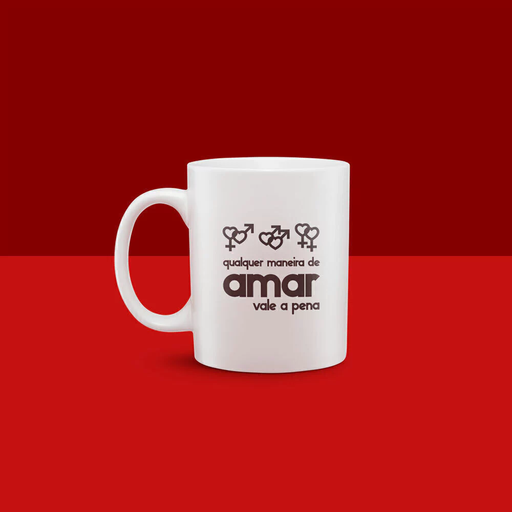 Caneca – Estampa na cor preta com imagem das duplas do símbolo em formato de coração: feminino e masculino, masculino e masculino, feminino e feminino com a frase “Qualquer maneira de amar vale a pena”.