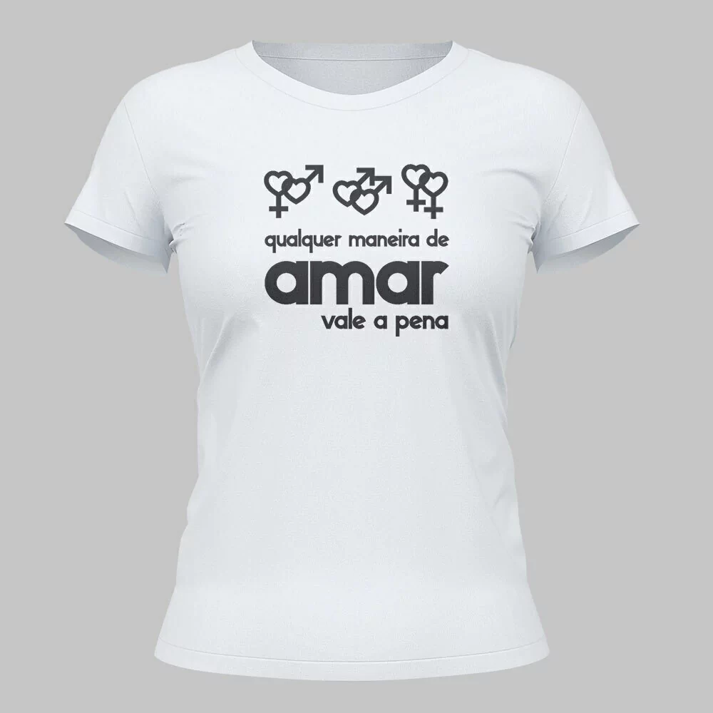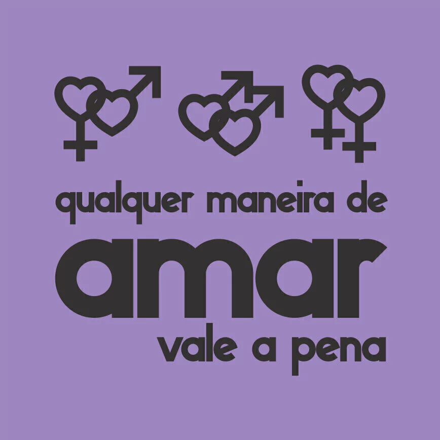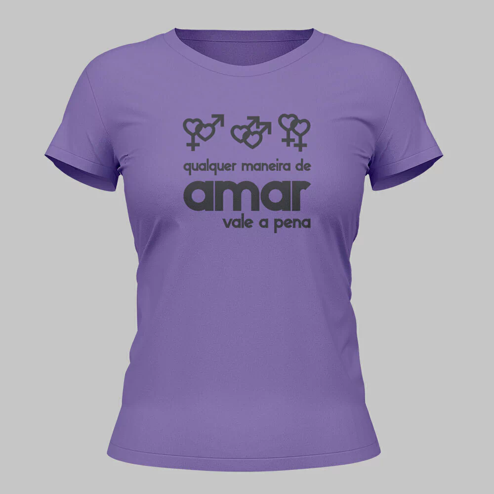 Camiseta lilás e branca – Estampa na cor preta com imagem das duplas do símbolo em formato de coração: feminino e masculino, masculino e masculino, feminino e feminino com a frase “Qualquer maneira de amar vale a pena”.