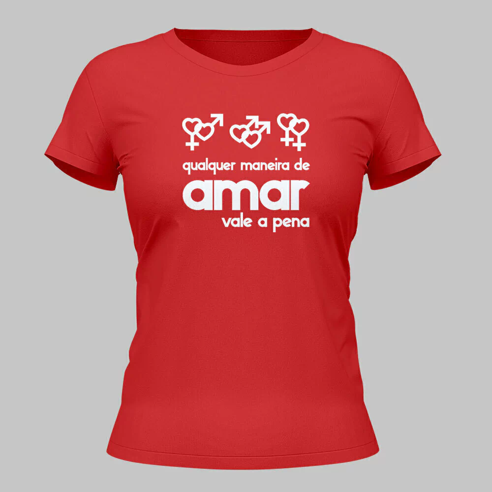 Camiseta preta e vermelha – Estampa na cor branca com imagem das duplas do símbolo em formato de coração: feminino e masculino, masculino e masculino, feminino e feminino com a frase “Qualquer maneira de amar vale a pena”.