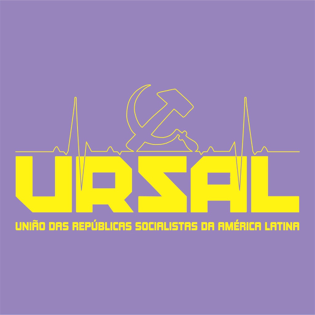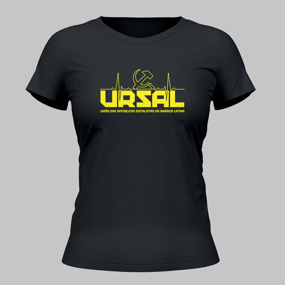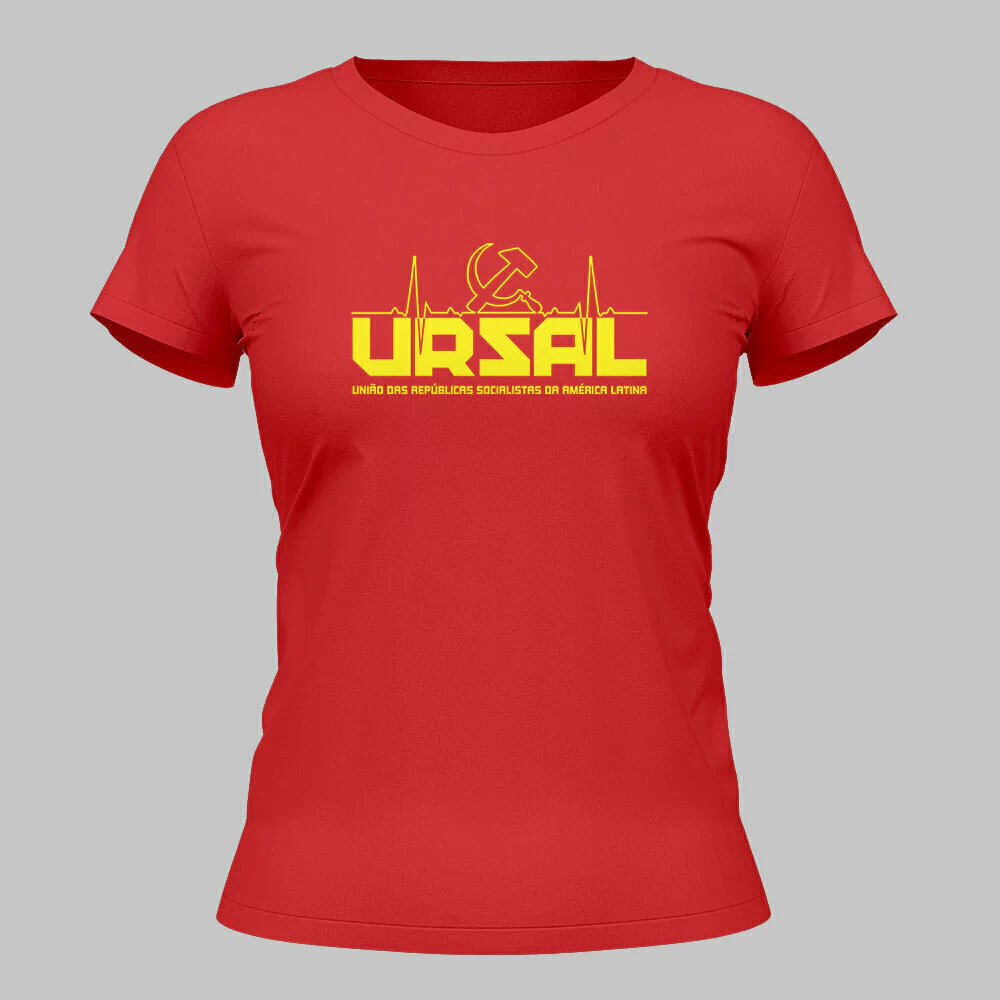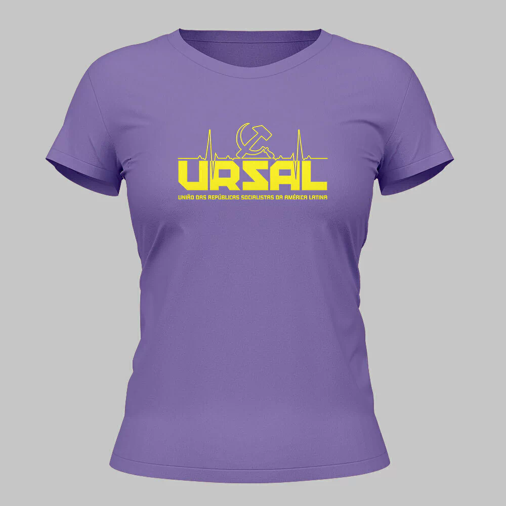 Camiseta vermelha, preto e lilás - Estampa na cor amarela com uma foice e um martelo fazendo batimentos cardíacos com a frase "Ursal" em destaque e abaixo em letras menores "União das repúblicas socialistas da América".