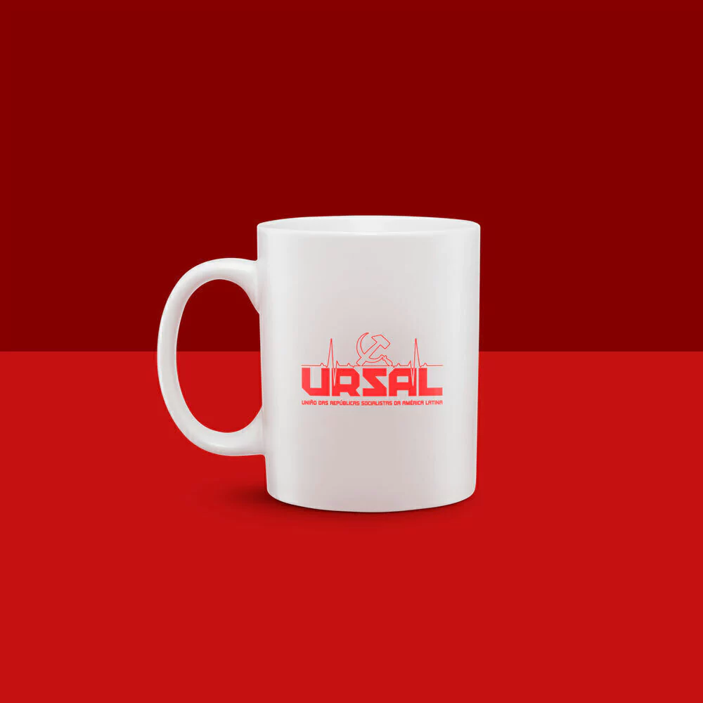 Caneca - Estampa na cor vermelha com uma foice e um martelo fazendo batimentos cardíacos com a frase "Ursal" em destaque e abaixo em letras menores "União das repúblicas socialistas da América".
