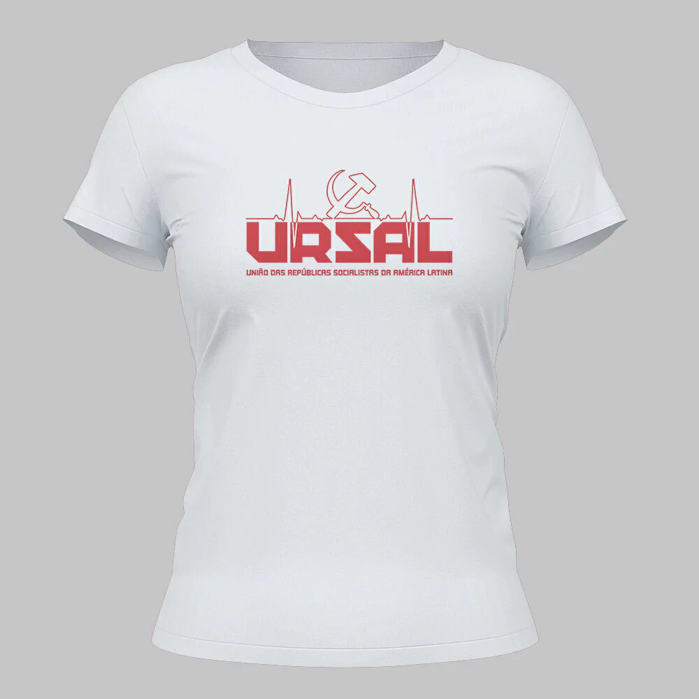 Camiseta branca - Estampa na cor vermelha com uma foice e um martelo fazendo batimentos cardíacos com a frase "Ursal" em destaque e abaixo em letras menores "União das repúblicas socialistas da América".