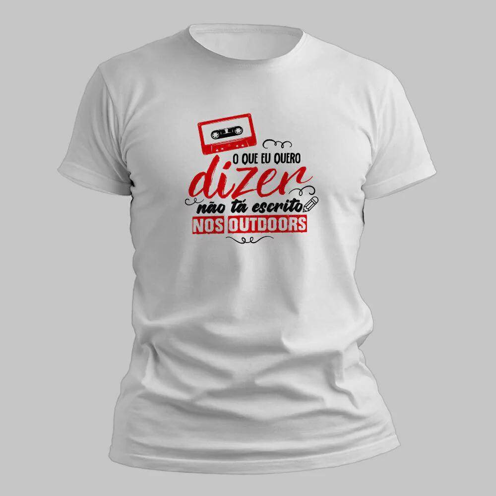 Camiseta lilás e branca - Estampa nas cores preto e vermelho com imagem estilizada de uma fita cassete e um lápis compondo a frase "O que eu quero dizer não tá escrito nos outdoors"
