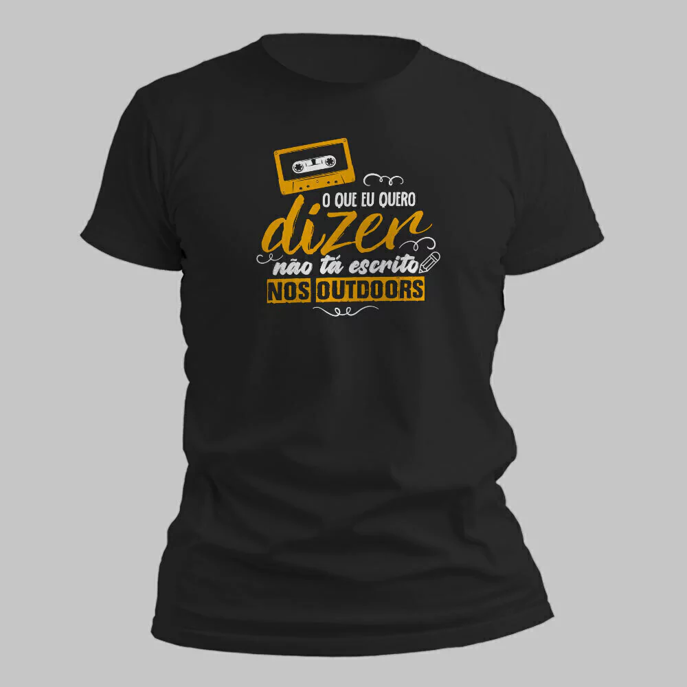 Camiseta preta, vermelha - Estampa nas cores preto e amarelo com imagem estilizada de uma fita cassete e um lápis compondo a frase "O que eu quero dizer não tá escrito nos outdoors"