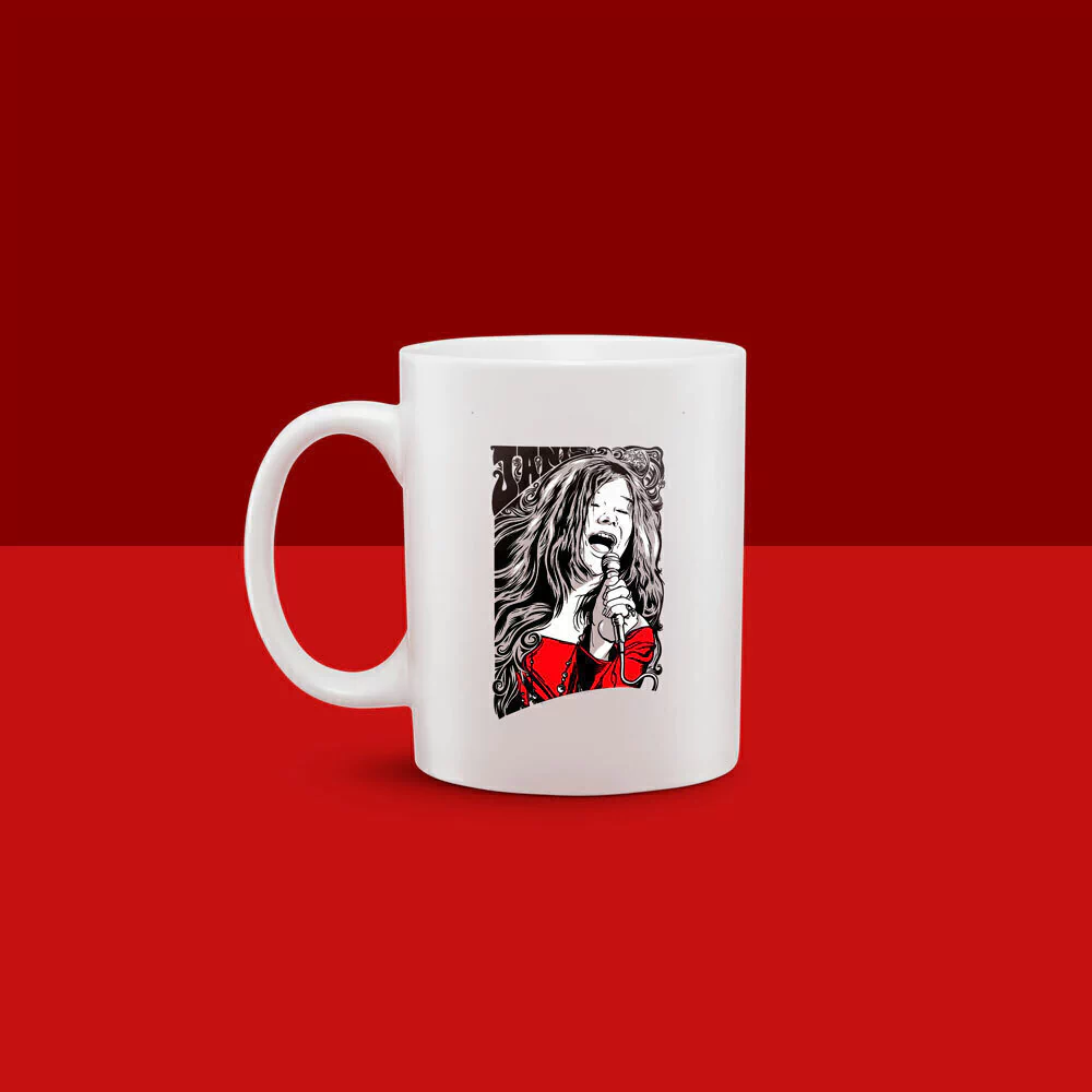Caneca – Ilustração (na cor preta e cinza) de Janis Joplin segurando um microfone e com roupa em vermelho.