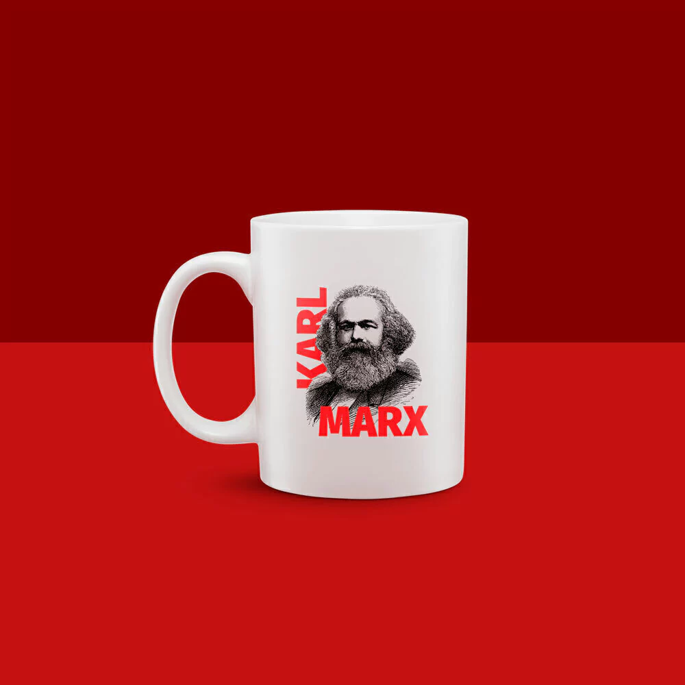 Caneca – Ilustração (na cor preta) de Karl Marx com a palavra "Karl" na vertical do lado esquerdo em vermelho e "Marx" na horizontal abaixo da figura do filósofo também em vermelho.