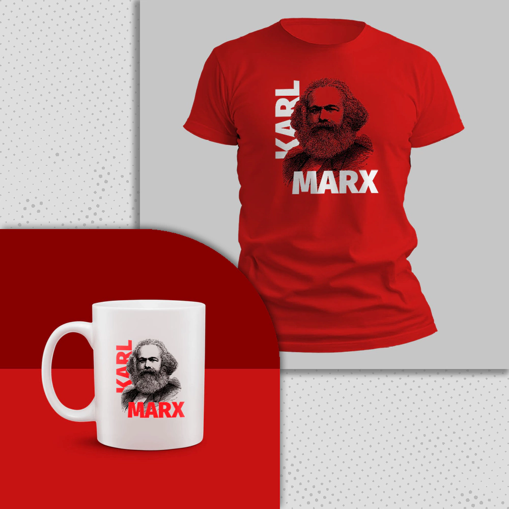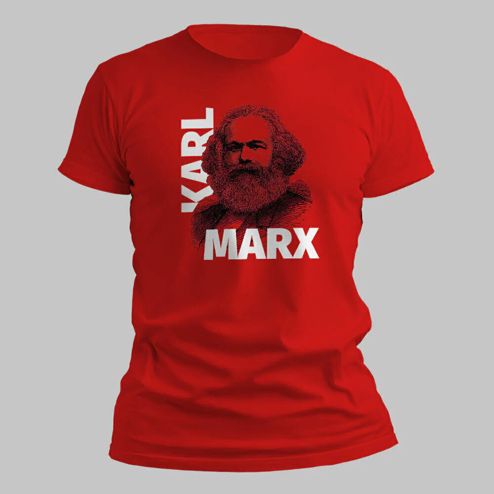 Camiseta vermelha – Ilustração (na cor preta) de Karl Marx com a palavra "Karl" na vertical do lado esquerdo em branco e "Marx" na horizontal abaixo da figura do filósofo também em branco.