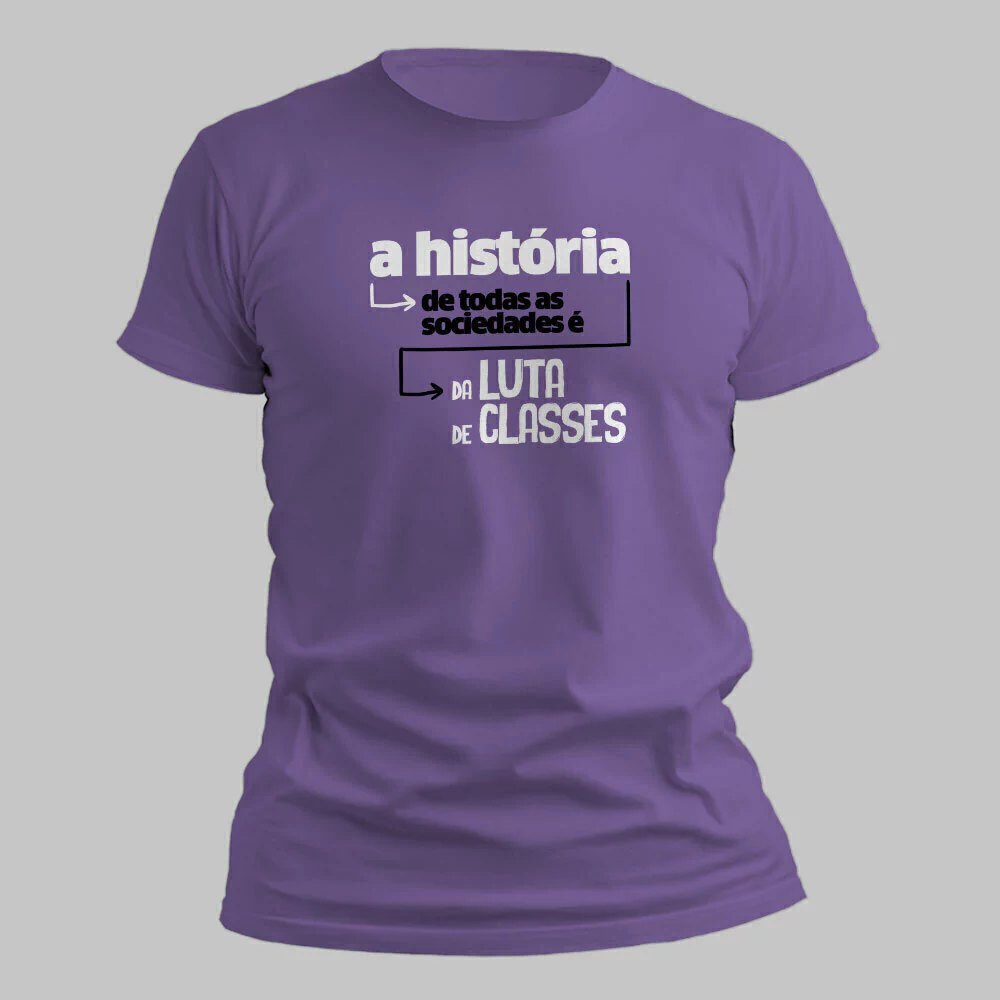 Camiseta lilás - Estampa nas cores preto e branco com setas compondo a frase "a história de todas as sociedades é a história da luta de classes"